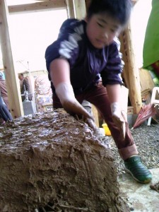 ゴム手袋をはめて、藁の塊に粘土を塗り込みます