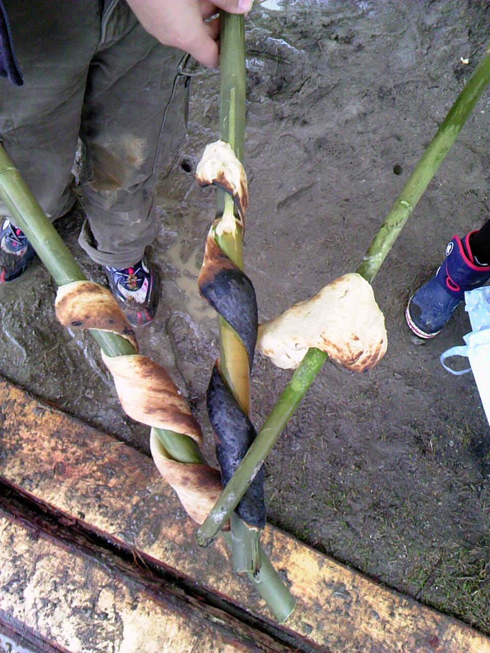 竹の棒にパン生地をクルクル巻いて、直火に当てて2〜3分。